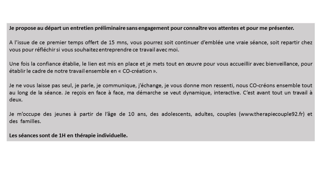 Dans son cabinet, l’accès aux soins est diversifié en fonction du besoin et du ressenti de l’instant présent. Elle peut proposer une thérapie gestalt inter-active en co-créativité ou tout aussi bien un soin énergétique avec un massage sonore, ou un travail sur les couleurs, sur les pierres, une illustration par un tirage avec des oracles, un travail en radiesthésie…